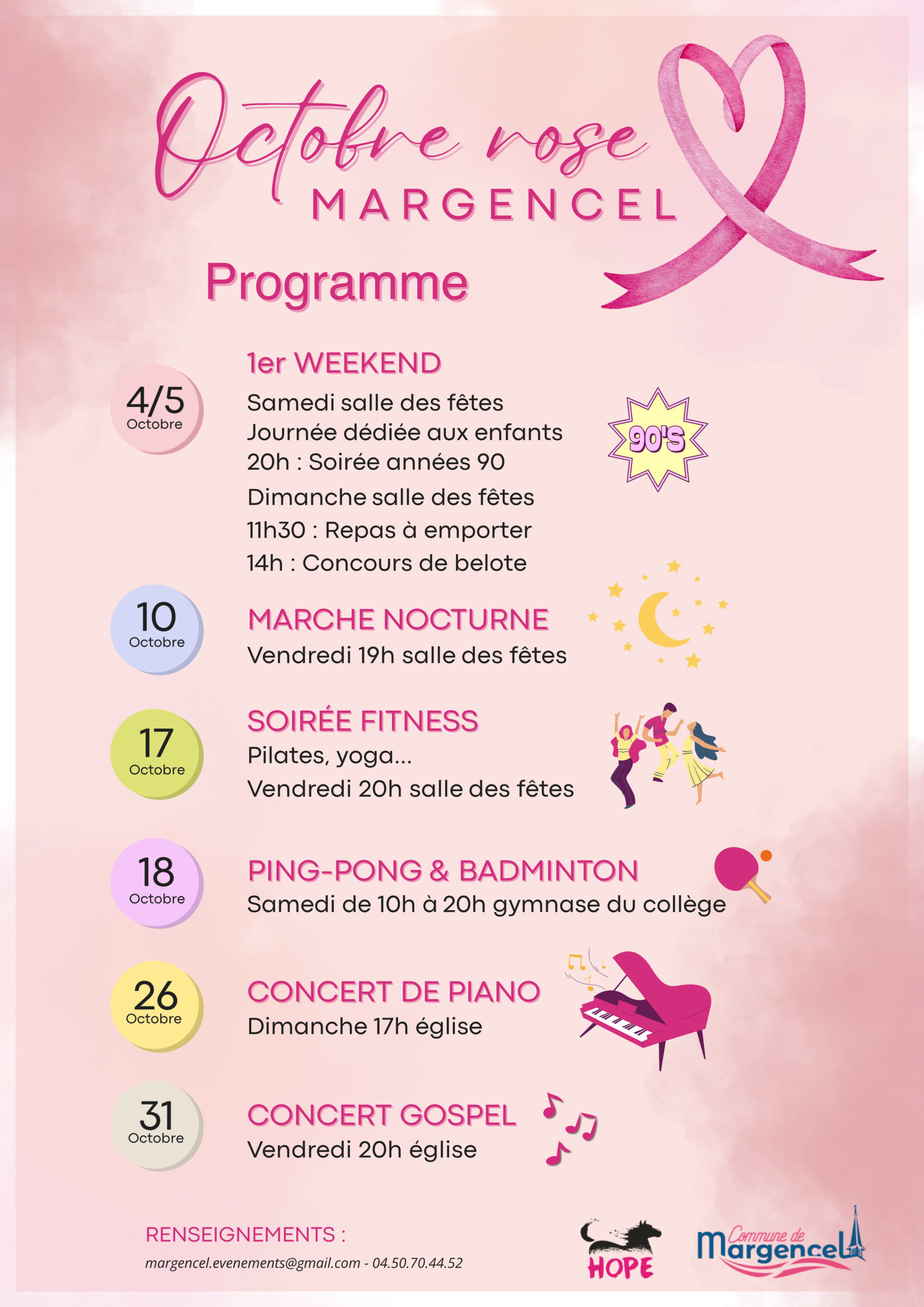 OCTOBRE ROSE 2025 À vos agendas !! OCTOBRE ROSE 2025 – LE PROGRAMME C’est à partir du 4 octobre et jusqu’au 31 octobre. Plusieurs événements se déroulerons tout le mois Télécharger le programme Renseignements : margencel.evenements@gmail.com + Ajouter à mon Agenda Google + iCal / Outlook export Date sam - ven 04 - 31 Oct 2025 Chargement... Heure Journée entière Catégorie Caritatif Partagez cet événement
